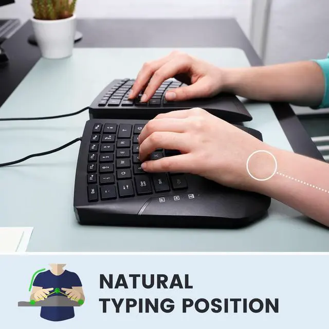 The natural shape of the keyboard promotes a relaxed typing posture and reduces forearm strains.