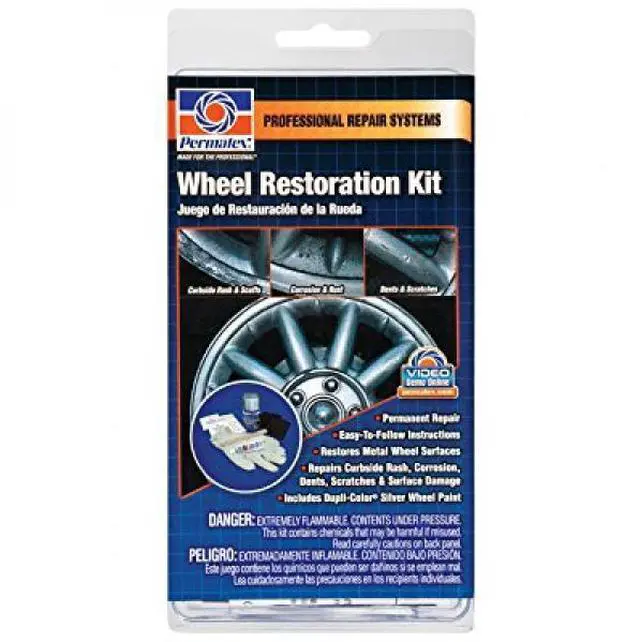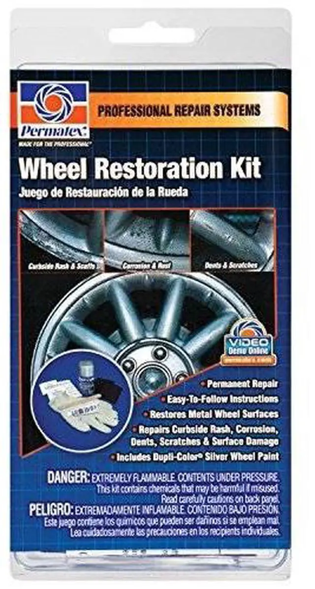 Permatex Wheel Restoration Kit restores damaged metal wheel surfaces to a LIKE NEW appearance. This easy -to-use, do it yourself kit repairs various unappealing wheel damage including curbside rash, corrosion, rust, pitting, scuffs, dents and scratches.