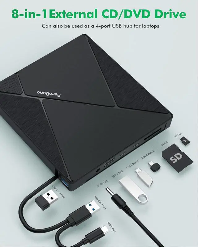 Fortunately, We have already done all the work for you. This multi-function 2 in 1 USB A/USB C data cable external USB 3.0 disc drive that we launched is not only a CD/DVD reader, but also it has the function of CD/DVD burner. At the same time, it is equipped with a variety of USB ports and SD/TF card slots to meet all your peripheral equipment needs - all for a decent price. This will allow you to have more budget to buy the latest laptops that are comfortable, smooth, and have powerful processors and graphics cards.