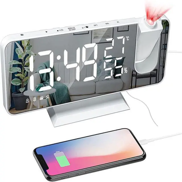 - This projection alarm clock has a 180° adjustable projection device, which can clearly project the time on the ceiling or wall in the dark.