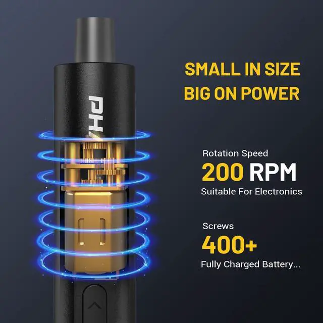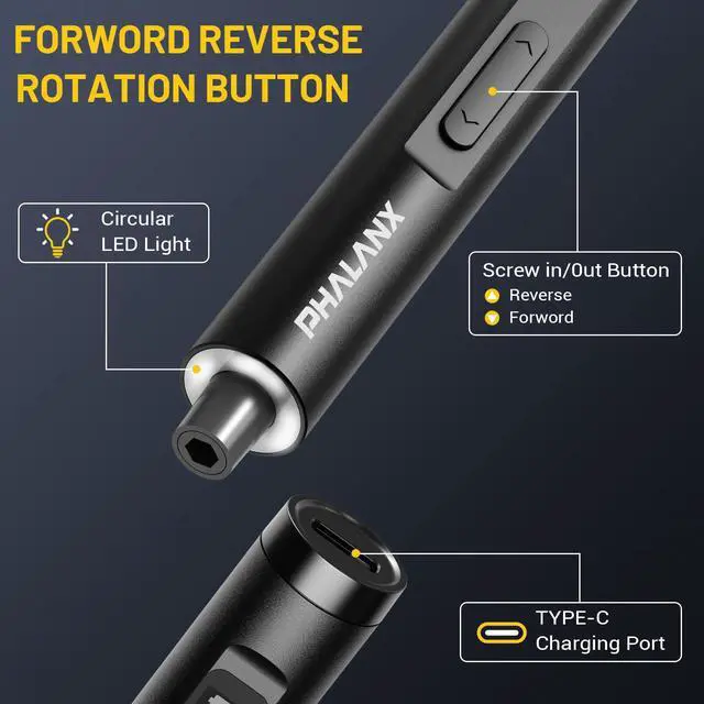 The PHALANX Precision Electric Screwdriver Set is a cordless electric screwdriver made for detailed repair tasks involving electronics, small devices, and DIY projects. With adjustable torque, a comprehensive bit set, and practical magnetic features, it serves as a functional tool for maintaining smartphones, laptops, watches, glasses, drones, and other gadgets.
