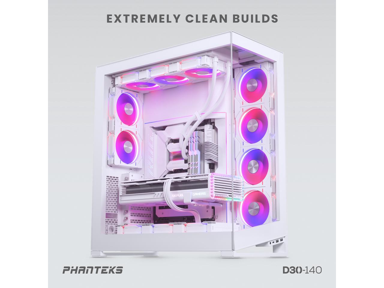 - The D-RGB lighting is integrated and visible from all sides of the D30-140 fan. The blades reflect the light coming from the Halos lighting ring inside the frame. Compatible with Digital-RGB equipped motherboards and Phanteks Digital-RGB products.