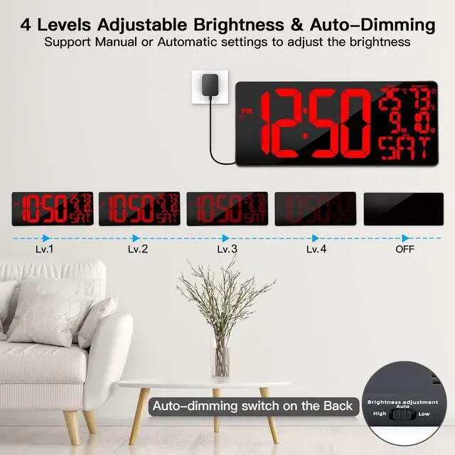 Automatic adjustment; It can be adjusted to a brightness that is more suitable for reading according to the intensity of the surrounding light. (The back of the large screen wall clock has automatic adjustment push button)