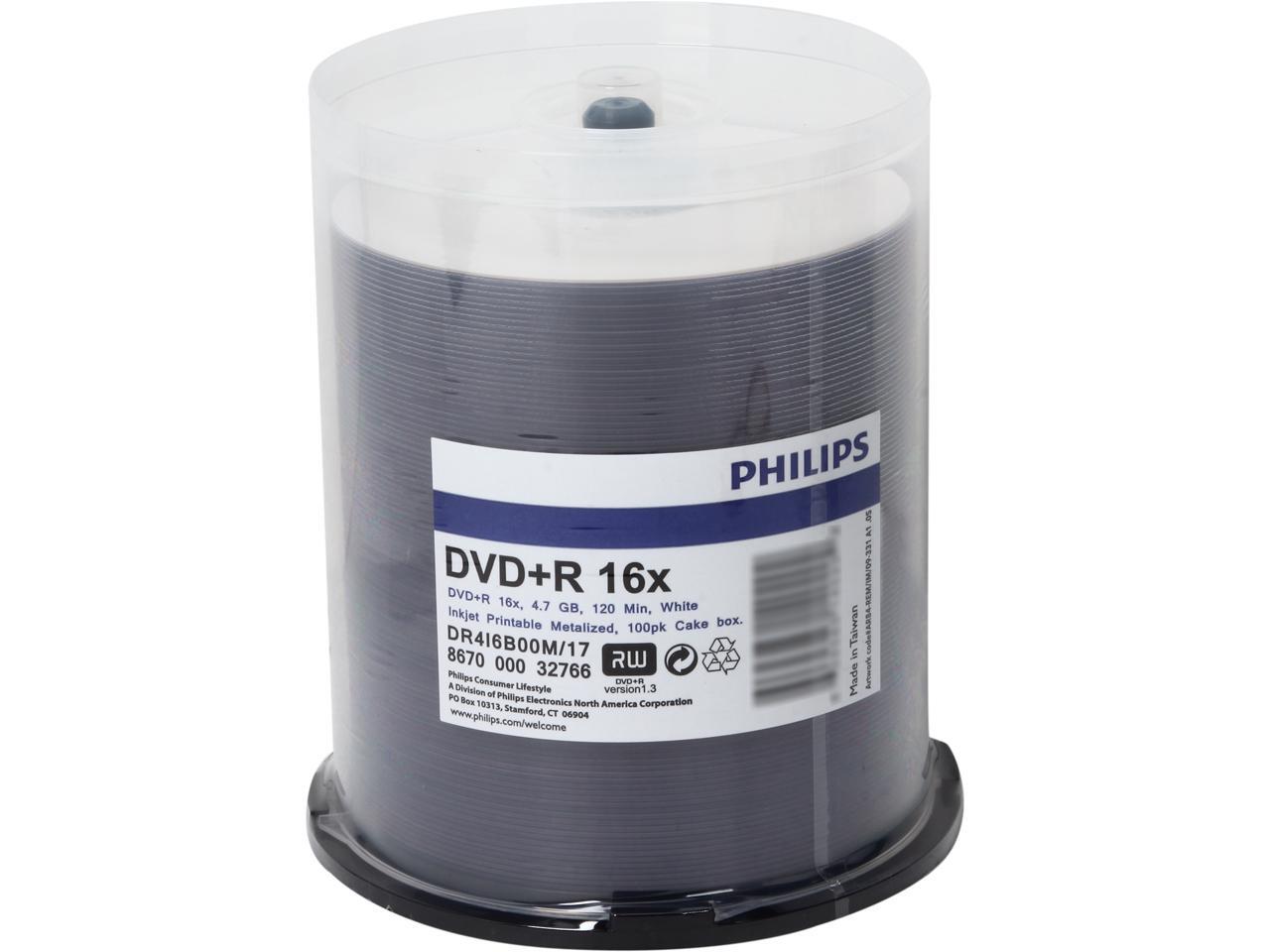 PHILIPS 4.7GB 16X DVD+R White Inkjet Hub Printable 100 Packs Spindle Disc Model DR4I6B00M/17