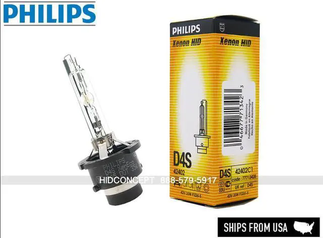 D4S - PHILIPS OEM 4300K 42402 HID XENON BULB MADE IN GERMANY Time to replace your Xenon HID (High Intensity Discharge) bulb? If your vehicle came with the Original Factory D4S HID lighting system, we highly recommend Philips D4S 42402 4300K bulb as a replacement. It is a direct replacement bulb if you currently use any (either OEM (Original Equipment Manufacturer) or aftermarket) D4S bulbs on your vehicle. We, HID CONCEPT, are Philips Authorized store, which means you will receive 100% Authentic Genuine Philips HID bulbs if you simply purchase it from us. Compatibility This Philips OEM D4S 42402 4300k, manufactured in Germany, is the industry’s standard.