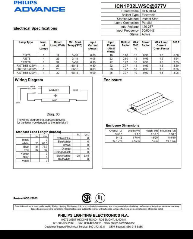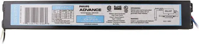 Philips Advance Centium Electronic fluorescent ballast is suitable to use with one 32-Watt F32T8 lamp. It has voltage rating of 120/277 Volts and current rating of 0.11 / 0.26 Amp. Instant start ballast with 0.91 ballast factor, has ignition time of 0.1 sec. It features metal N housing. Ballast accommodates solid wire of size 18 AWG. It offers 0.98 power factor. This ballast has parallel lamp connection. It operates at the frequency rating of 50 - 60 Hz. It measures 9.5 Inch x 1.3 Inch x 1 Inch. B