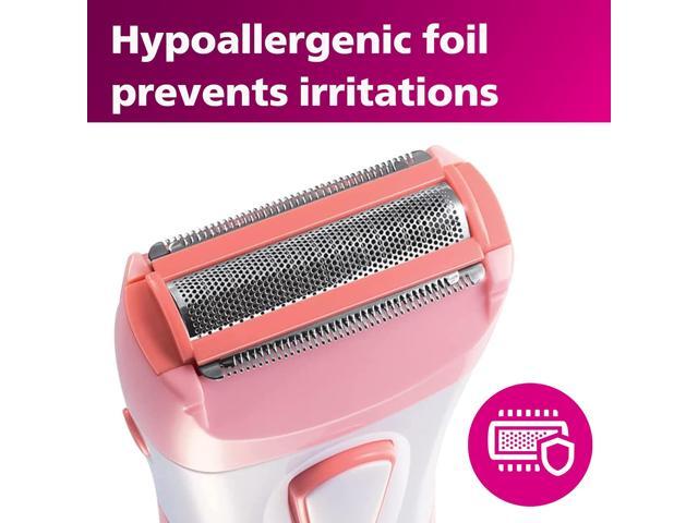 - Safe shaving system with hypoallergenic foil protects sensitive areas from nicks and cuts