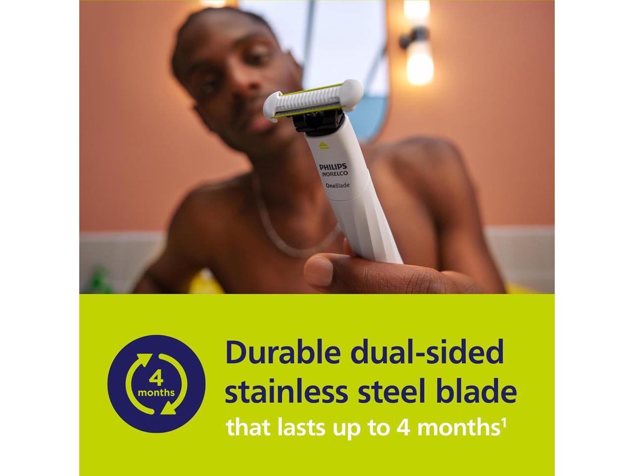 Stainless steel blades last up to 4 months(For best shaving experience. Based on 2 full shaves per week. Actual results may vary.)