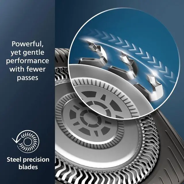 With up to 90,000 cutting actions per minute, the SteelPrecision blades shave close, cutting more hair per stroke*. The 45 high-performance blades are self-sharpening and made in Europe.