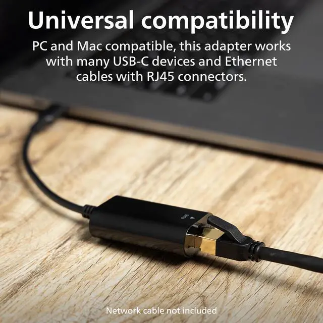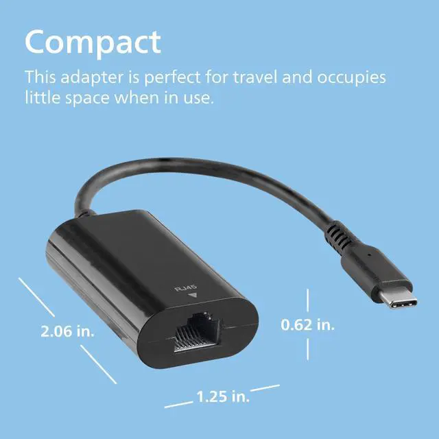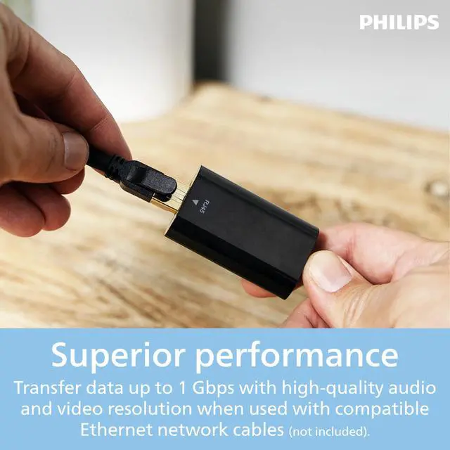 Expand your connectivity with the high-quality connection of the Philips USB-C to Ethernet Adapter. This compact adapter allows you to connect your USB-C equipped computer or laptop to a high-speed network device, such as a modem, router, printer, streaming device or game console with the use of an Ethernet cable (not included). When Wi-Fi is slow or not available, a direct connection lets you surf the internet, stream audio and video, play your most intense video games and transfer data up to 1 Gbps with high-quality audio and video resolution when used with compatible Ethernet network cables (not included).Small and lightweight, this adapter is perfect for travel. It easily tucks into a laptop bag, briefcase or backpack and occupies little space when in use. Additionally, its plug-and-play connectivity makes setup a breeze. Its the perfect accessory for use at home, in the office and when youre on the go. Make a reliable network connection with the Philips USB-C to Ethernet Adapter.