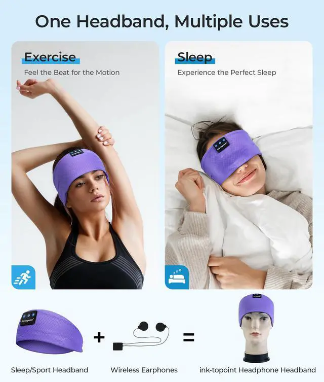 2-In-1 Sleep Headband Headphones This 2-in-1 Sleep & Sports headphones combines wireless bluetooth and mask, used to be a sweat-wicking sports headband,and a comfortable sleep mask for sleeping, sports, travel and work. This ink-topoint bluetooth headband meets all your daily needs.