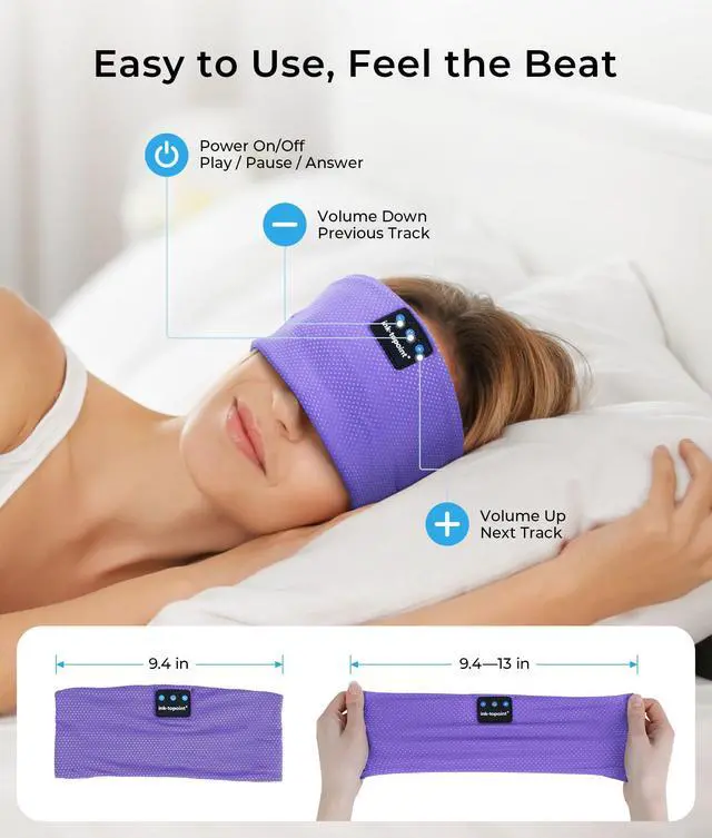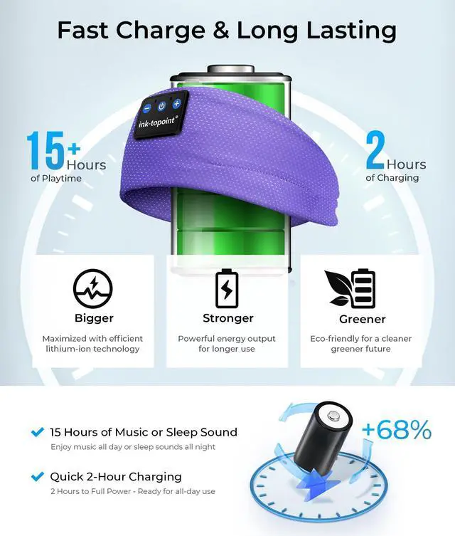 Long-Lasting Battery Life Music Headband This sleep mask headphones stay powered all day with a 15-hour battery life and 2-hour fast USB-C charging. ink-topoint Bluetooth Headband Headphones supports marathons, flights, or overnight sleepno interruptions.