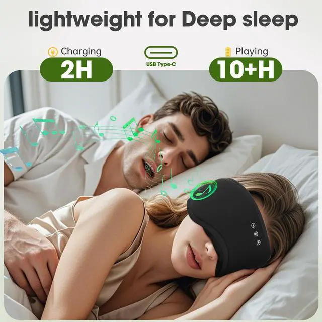 Bluetooth Sleep Mask with Hi-Fi Stereo, Sleep Headphones Bluetooth Sleep Mask Headphones only charge for about 1-2 hours and provide 10 hours+ of playback time, supporting a full night. Convenient Type-C charging port for easy charging.