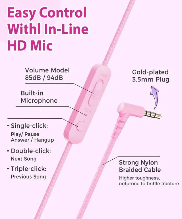 • [ Durable & Tangle-free ] Rockpapa C24 wired headphones with microphone is made by the strong and sturdy plastic and no tangle 4.9ft nylon braiding cord ensure long-lasting resilience and durability, Suitable for kids over 4 years old, child, boy, girl, teen, youth, women, adult.