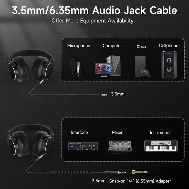 WIRED HEADPHONES OPTION: This headphone features detachable 6.35mm and 3.5mm plugs, offering compatibility with a wide range of devices like keyboard, TV, stereo, mixer, pc, computer Laptop, tablet and smartphones. Its 9.8 ft coiled cord (stretched length) ensures flexibility and convenience, easily reaching from your audio source to your listening position. Ideal for professional and everyday use, this design prioritizes versatility and user comfort