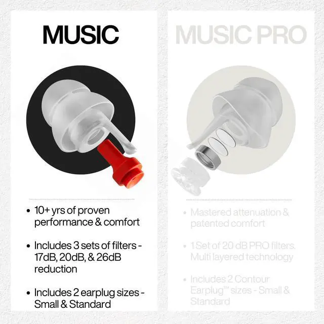 MUSIC uses a double-coned design with 3 filters (17dB, 20dB, 26dB). MUSIC PRO features a Contour Earplug for a near-custom fit and a 20dB PRO filter for precise, full-spectrum sound.