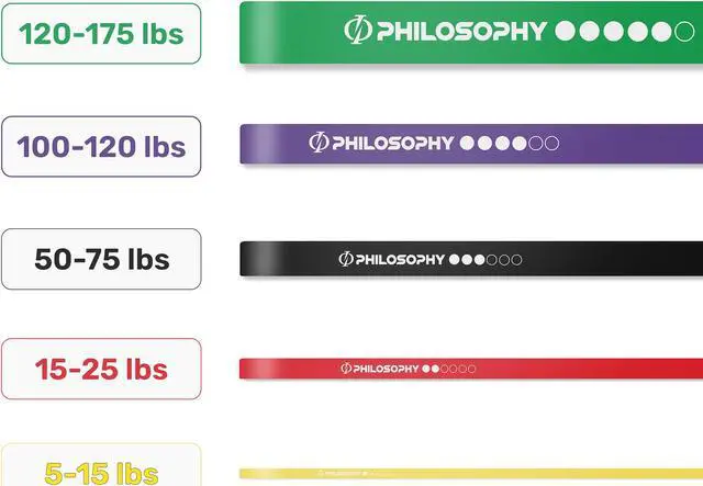 Whether you are training, doing physical therapy or looking for an efficient way to boost your strength you can count on this set of heavy-duty resistance fitness bands to be a trusted workout tool. They are constructed of 4.5mm thick durable rubber to hold up to repeated use so you can stick with your daily workouts. These assist bands are all 41 in length and are color-coded by width and offer varying levels of resistance. Yellow 1/4" (5-15 LB), Red 1/2" (15-25 LB), Black 3/4" (50-75 LB), Purple 1 1/4" (100-120 LB), Green 1 3/4" (120-175 LB), Blue 2 1/2" (175-230 LB).