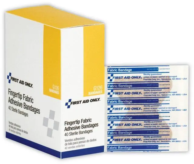 Assortment of bandages for cuts and abrasions in the workplace or home. Packaged for individual use and to replenish first aid stations and kits. Bandages Type: Fingertip; Mounting: With Adhesive; Length: 3"; Width: 1.75".