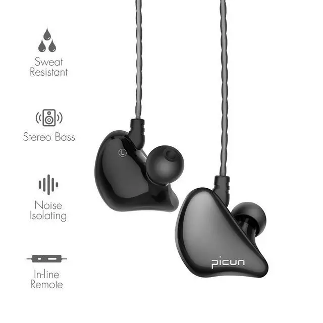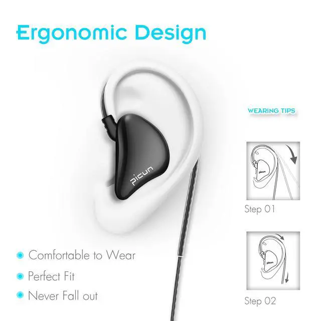 1.Professional Design for Sports.The Picun S6 is a professional sport headphones, combining a secure fit that never falls out with dynamic sound and a rugged, sweat-proof design. And there are 3 pairs of different size of silicone eartips, so it will fit everyone's ear hols size, no matter adults or children, it will fit very well.
