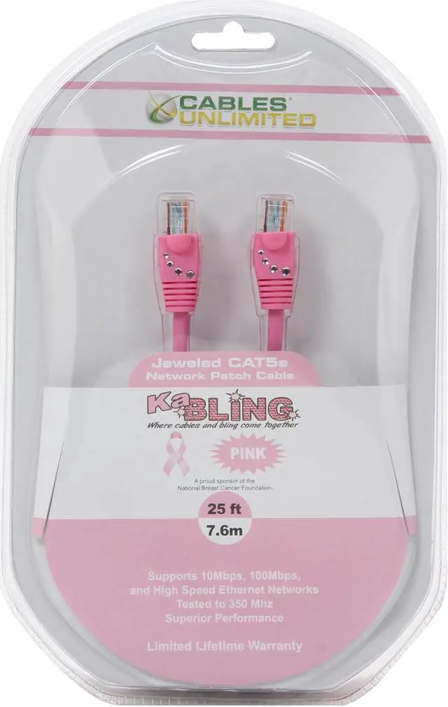 Cables Unlimited Ka-Bling designer network patch cable is the perfect accessory for any laptop or desktop. This striking pink Cat5e cable with beautiful crystals will add style to any computer system while helping to support the fight against breast cancer. Cables Unlimited is a proud sponsor of the NBCF/National Breast Cancer Foundation.
