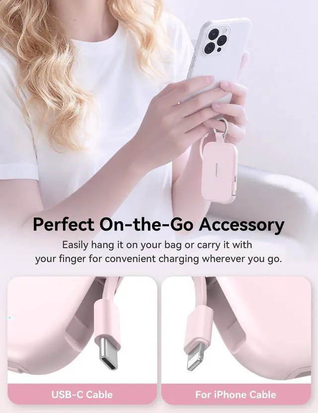 Portable Charger, 5000mAh Portable Charger Power Bank with Built-in Cables, Travel Keychain Charger Battery Pack for iPhone 17/16/15/14/13/12, for AirPods 2/3/4/Pro, Pink