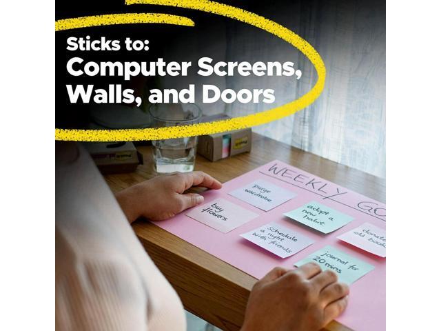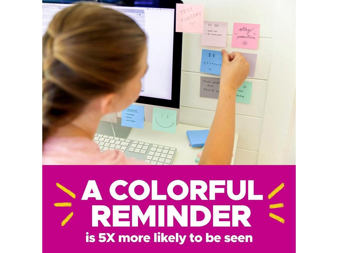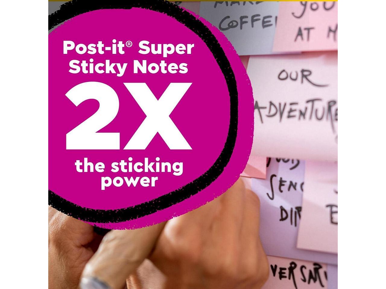 - EXPERIENCE THE POWER OF 2X STICKINESS: Post-it Super Sticky Notes offer twice the sticking power of basic sticky notes using 100% recycled paper. EYE-CATCHING COLORS: Vibrant and colorful reminders are more likely to grab attention and be noticed. SUSTAINABILITY: Post-it Super Sticky Notes can be recycled.
