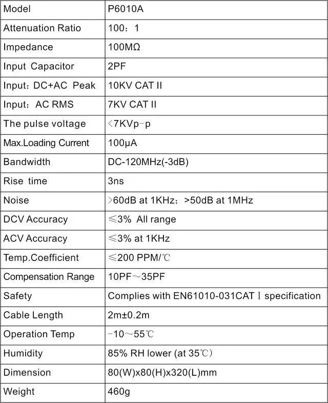 • Attenuation Rate: 100:1, the oscilloscope probe make your test safe.