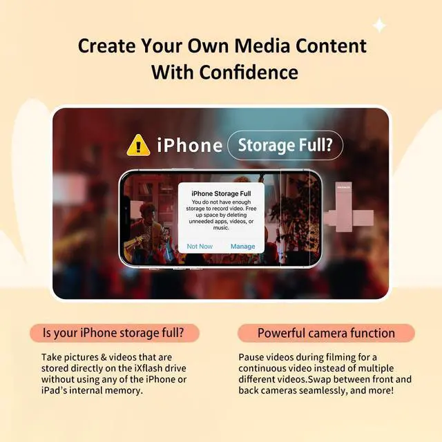 ***[Capture Photos and Videos Directly to the Drive] - Save iPhone storage by capturing photos and videos directly onto the iXflash. This feature is perfect for users looking for external storage for iPhone photos, enabling seamless recording without worrying about device memory limits. The iXflash is a versatile storage stick for iPhone, perfect for capturing moments on the go.