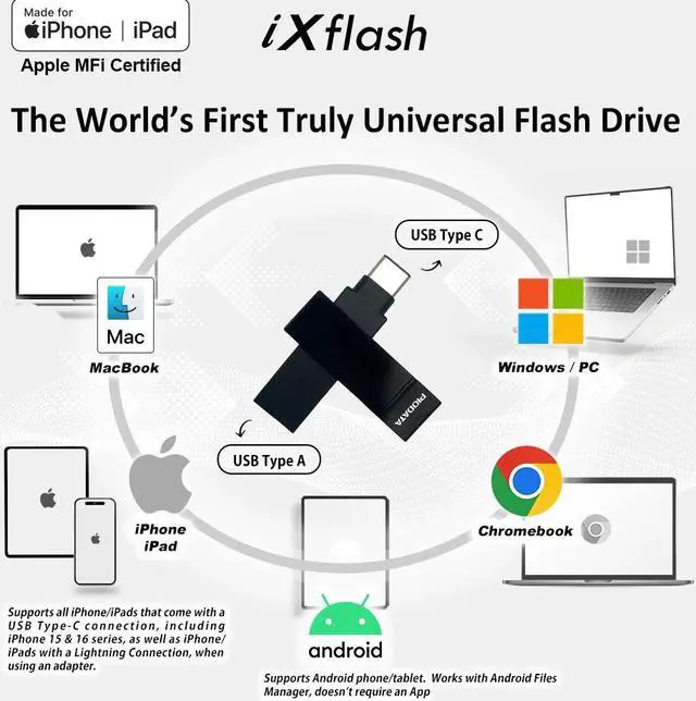 - Apple iPhone Offers USB Type A and USB Type C Connections - The iXflash is a USB 3.2 Gen1 drive with USB Type A and USB Type C connectors, plus a USB-C to Lightning adapter for compatibility with iPhones and iPads. It works with most USB/Lightning devices like computers, iPhones, iPads, Android devices, TVs, and car stereos. Ideal for iPhone photo transfers and works with the iXflash App for iPhone/iPad.
