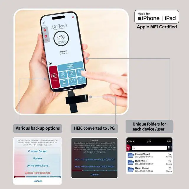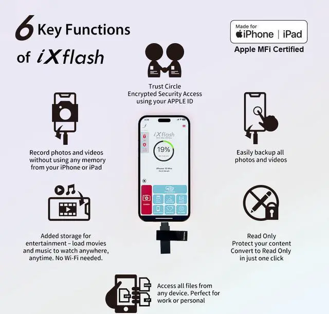 - World's First MFi Certified Flash Drive for Back-Up & Transfer - Effortlessly back up and restore photos, videos, and files, preserving formats and metadata. The iXflash enables easy file transfer between iPhones, iPads, and computers, perfect for photo and file storage.