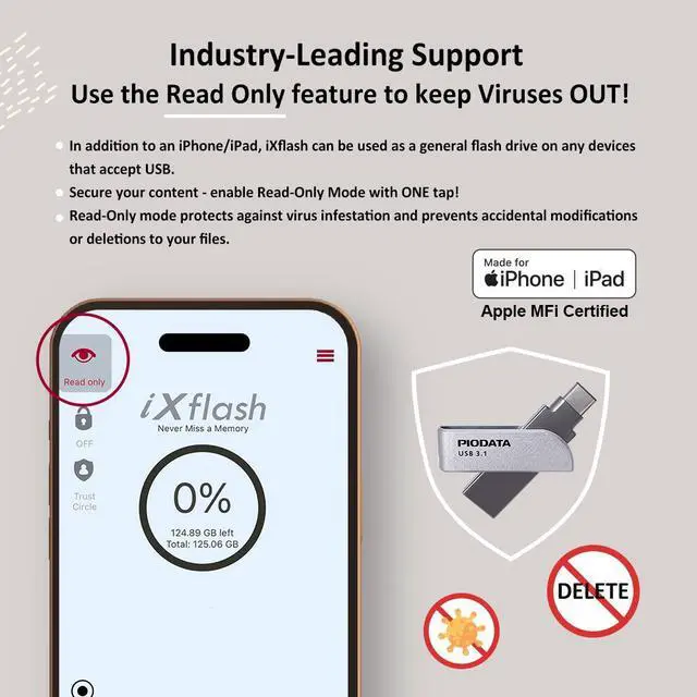 *** [Advanced Security with Trust Circle and Read Only Protection] The patented Trust Circle AES 256 Key-Lock security prevents unauthorized access to your stored data. Only authorized users within the "Trust Circle" can access the files, ensuring complete privacy. Additionally, the Read Only feature safeguards files from being modified or deleted and shields the drive from potential viruses, making it a secure USB flash drive for iPhones, iPads, and other devices.