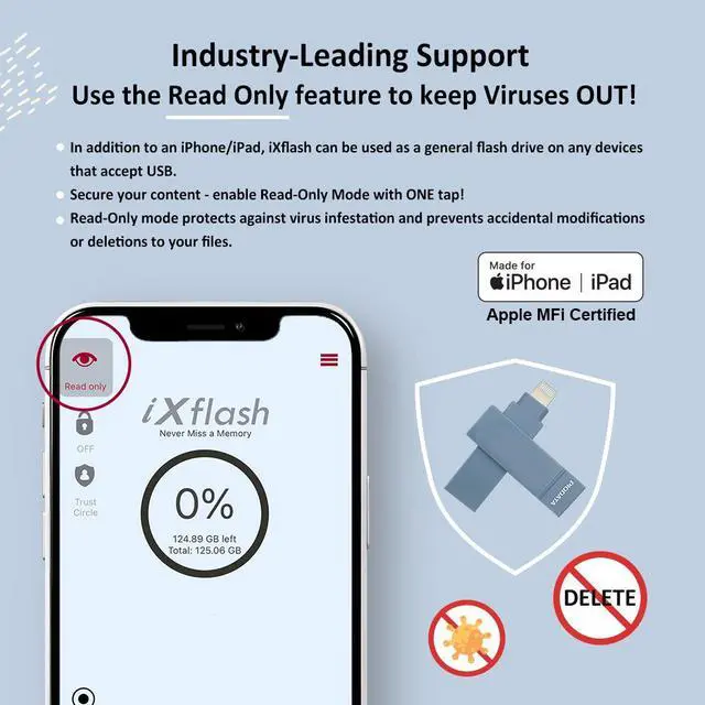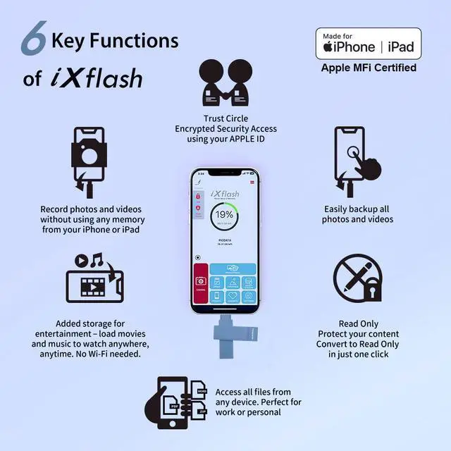 ***[Enhanced Security with Trust Circle AES 256 & Read-Only Protection] - Protect your data with the patented Trust Circle security feature, utilizing AES 256 Key-Lock encryption for privacy. Only authorized users can access the drive, offering complete protection for your files. Additionally, the Read-Only mode prevents accidental deletion and guards against viruses, making it the safest USB photo storage flash drive for iPhone and other devices.