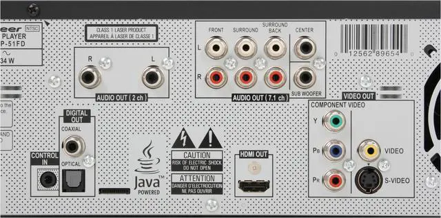 | Connectors | 1 x Audio line-out ( RCA phono x 2 ) - Rear 1 x Digital audio output (coaxial) ( RCA phono ) - Rear 1 x Digital audio output (optical) ( TOSLINK ) - Rear 1 x 7.1 channel audio line-out ( RCA phono x 8 ) - Rear 1 x HDMI output ( 19 pin HDMI Type A ) - Rear 1 x Component video output ( RCA phono x 3 ) - Rear 1 x Composite video output ( RCA phono ) 1 x S-Video output ( 4 pin mini-DIN ) |