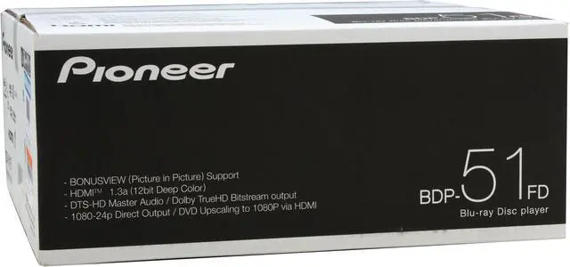 | Feature | Spectacular 1080p Picture Quality: The BDP-51FD provides up to 1920 x 1080p resolution for an unrivaled picture quality. And with True24FPS, now see your movies as the director intended. Single-Wire Connection: One HDMI 1.3a digital connection is all you need from the BDP-51FD to output both HD audio and video signals to your HDMI-capable A/V receiver or HD flat panel. Compared to typical connections, the HDMI interface replaces multiple cords without degradation in signal quality between components. HDMI 1.3a also provides 12-bit deep color support, improving subtle gradations between colors. HDMI Control: Master your home theater universe. The BDP-51FD supports HDMI Control, which allows you to seamlessly control all your HDMI Control-equipped Pioneer A/V equipment with a single remote. Wolfson Audio DACs: Each DAC features a signal-to-noise ratio of 117db. Wolfson DACs provide top-notch audio performance from music and movie soundtracks. Exclusive Jitter Reduction Circuit: Utilizing a Pioneer developed IC, this circuit digitally reshapes the waveform of the audio clock to greatly reduce jitter for all content. Frequency Control Circuit: By tuning the low-pass filter, waveform distortion of the coaxial digital output is greatly reduced for improved audio performance. Picture Control Suite: 13 different video adjustments (Progressive Motion, PureCinema, YNR, CNR, BNR, MNR, Detail, White Level, Black Level, Black Setup, Gamma Correction, Hue, and Chroma Level) 3 Different Noise Reduction Circuits: based on pixel-per-pixel basis to reduce Gaussian Noise without blurring the image. Lock and Mosquito Noise Reduction to enhance poorly created content. BonusView Support: Independent High-Definition simultaneous video streams. Watch your Blu-ray disc movies while watching the bonus features at the same time. (Picture-in-Picture) Easy Operation and Setup: New Advanced HD GUIs for easy navigation. |