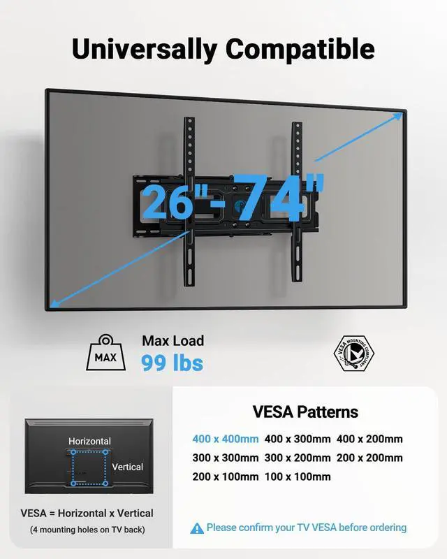 Your TV is compatible with this mount as long as it meets three criteria: screen size between 26 and 74 inches, weight no more than 99 lbs, and feature a VESA mounting hole pattern of 100×100 mm (3.93"×3.93") to 400×400 mm (15.75"×15.75").