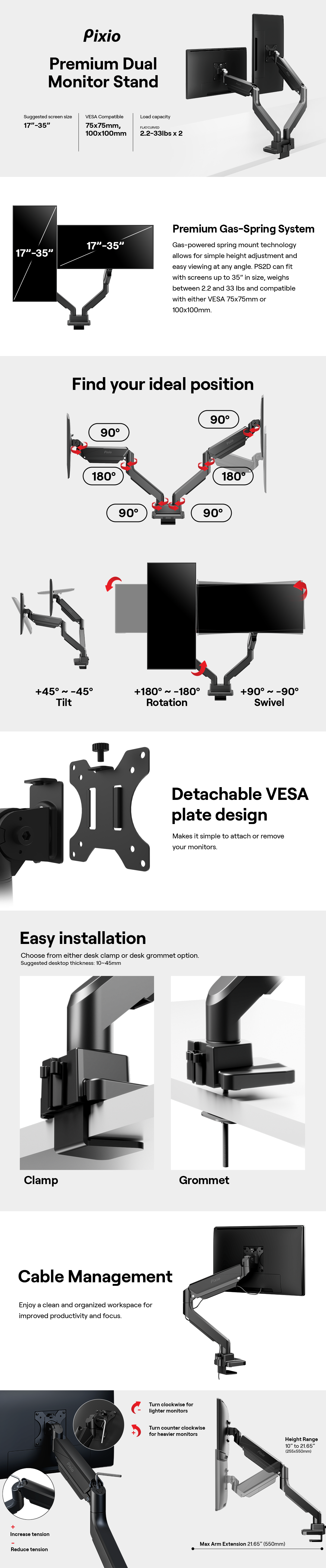 Pixio PS2D Heavy-duty Gas Spring Fully Adjustable Universal Mount 100x100mm 75x75mm Premium Dual Monitor Desk Mount, Supports two monitors up to 35" & 33lbs