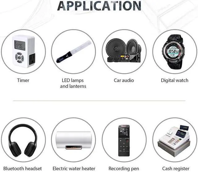 Applications: Laser Pointer, Hearing Aids, Insulin Pumps, Heart Rate Monitor, Watches, Cameras, Calculators, Car Security Alarm, Keyless Car Remotes, Organizers, Glucometer, Computer Equipment (memory backup battery) CMOS, Toys, Communication Equipment,