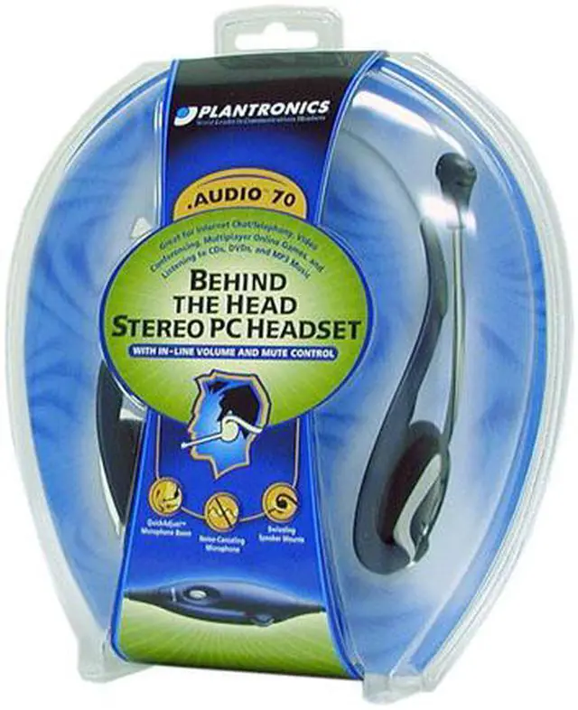 | Features | For music, games, speech recognition, Internet chat/telephony, and video conferencing, the Plantronics .Audio 70 Behind-The-Head stereo PC headset features awesome stereo sound and a superior speech-recognition microphone for improved voice recognition accuracy. Equipped with convenient inline volume and mute controls and a QuickAdjust microphone boom that ensures correct placement for speech applications. The flexible headband and soft, swivel-mounted ear cushions let you work or play in comfort. Compatible with popular PC sound cards, just plug it in and start talking. The .Audio 70 PC headset is lightweight and comfortable, with a new behind-the-head design. Full-range stereo sound Superior speech recognition microphone Inline volume and mute controls Lightweight, comfortable, behind-the-head design Compatible with popular PC sound cards Works on Windows systems Compatible with Microsoft Windows XP |