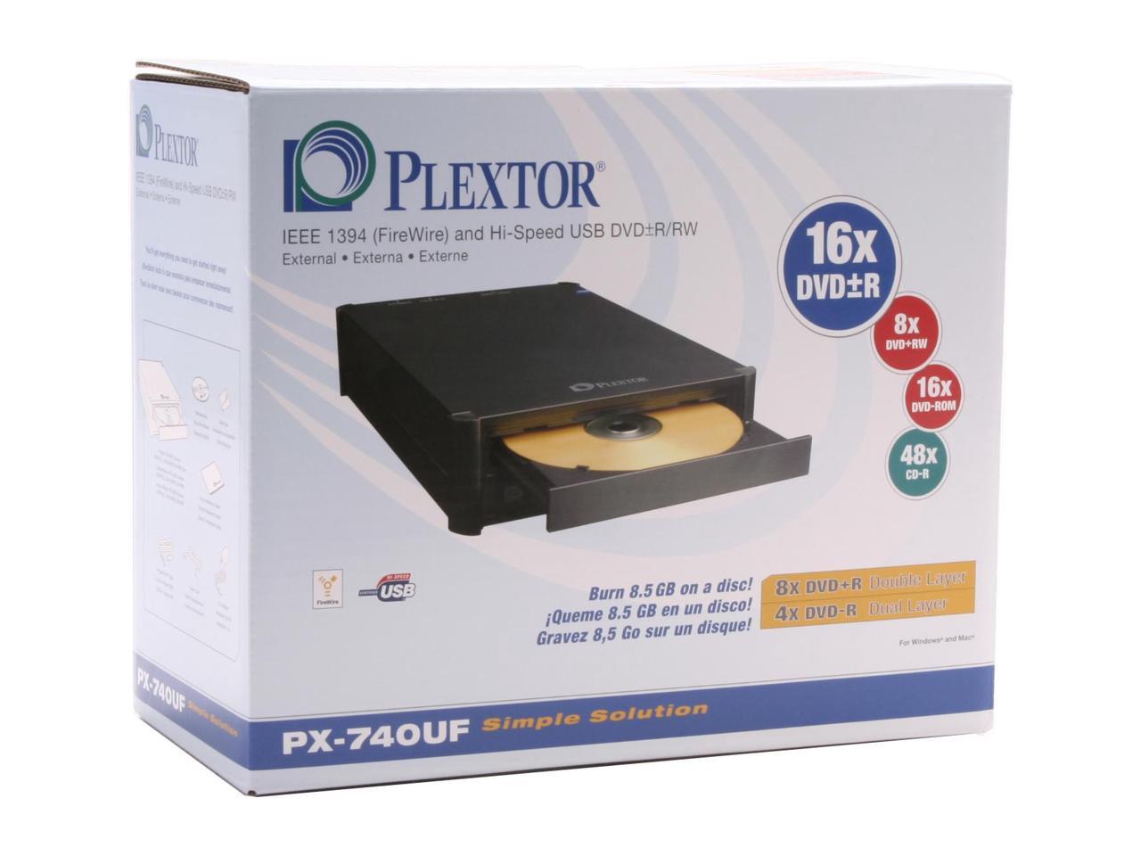 PLEXTOR Black 16X DVD+R 8X DVD+RW 8X DVD+R DL 16X DVD-R 6X DVD-RW 16X DVD-ROM 48X CD-R 32X CD-RW 48X CD-ROM 2M Cache IEEE 1394 / USB 2.0 External DVD Burner Model PX-740UF/SW-BK