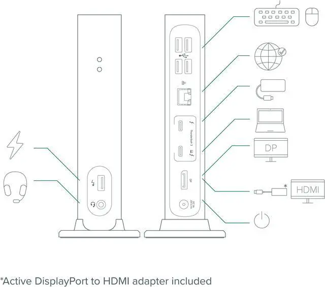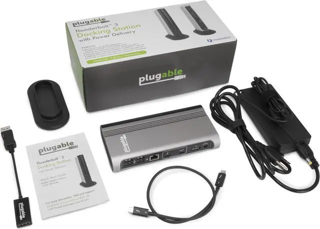 Thunderbolt 3 TBT3-UDV docking station, 0.5 meter (20 inches) Thunderbolt 3 40Gbps cable, DisplayPort to HDMI active adapter, quick installation guide and a 20V/6.75A (135W) power adapter (US AC Wall Outlet Plug, 100-240V 50/60Hz)