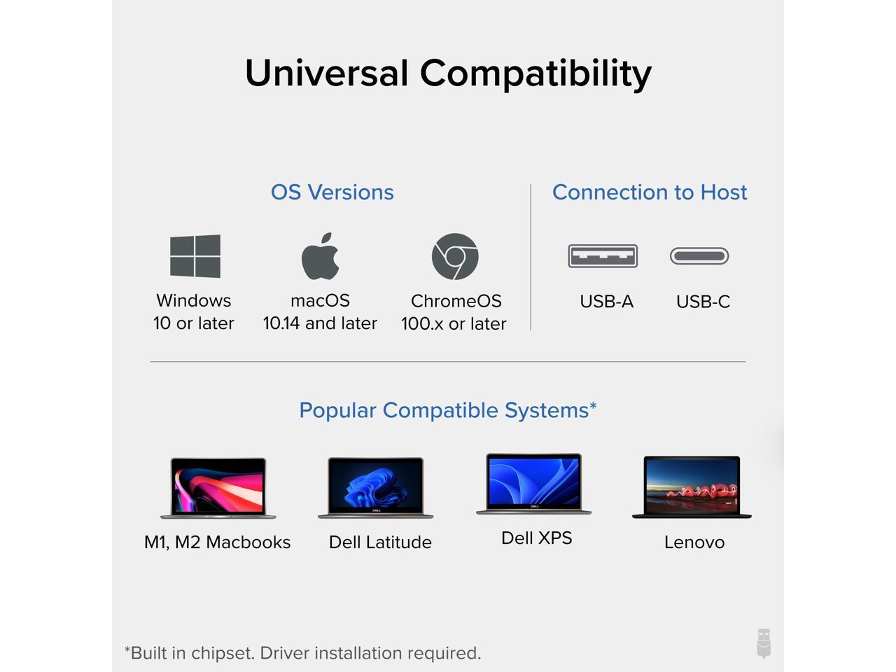 - SYSTEM REQUIREMENTS - Universal docking station is compatible with modern Windows and Mac systems with USB 3.0 Type-A or Type-C ports with DisplayLink USB Graphics driver installed. Recommended hardware specifications can be found in the listing below