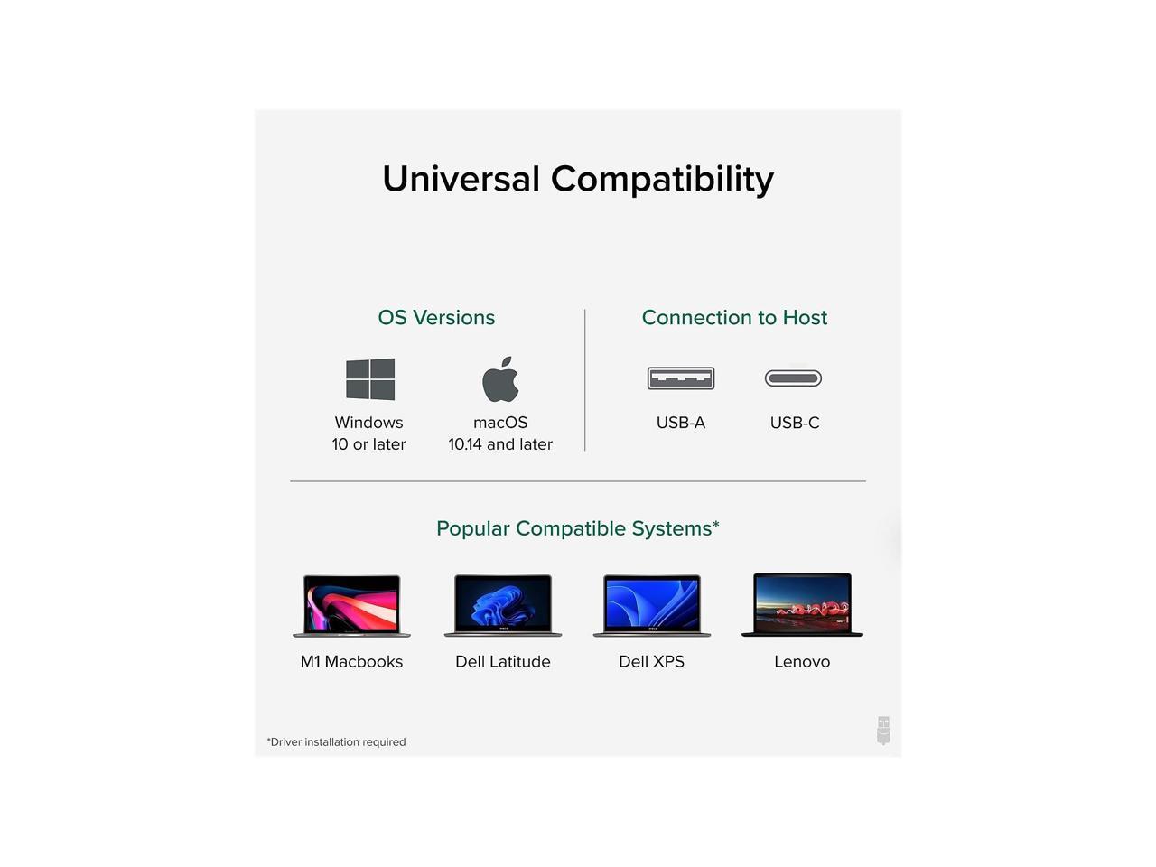 - COMPATIBILITY - For Windows 11, 10, 8.x, and 7 and macOS 10.14+ with driver installation. Linux/Unix not supported. Does not charge or power the host computer. Suggested use: web and productivity software; not recommended: gaming, video playback, 2D/3D graphic tools