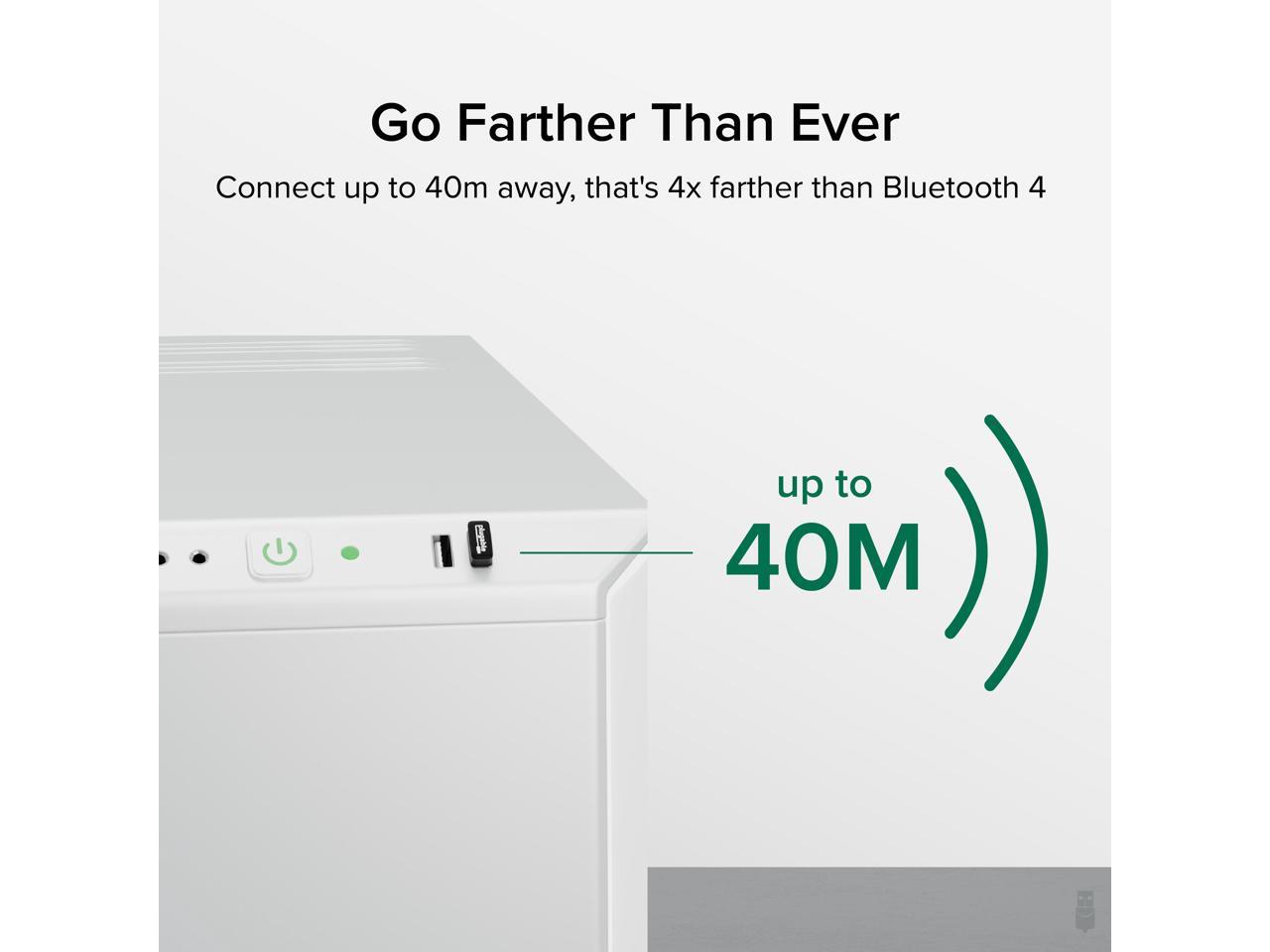 - Go Farther - You're not using a cord, why are you tethered? With a range of up to 40M, add this Bluetooth 5 Adapter to your computer to connect to your Bluetooth enabled speakers, headsets, printers, keyboards, phones, controllers, etc.