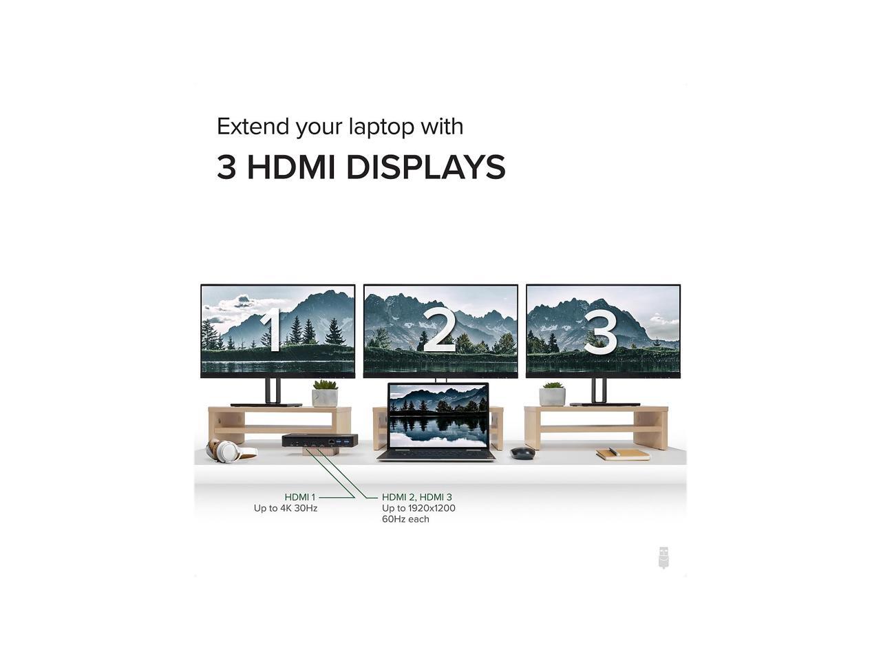 - Triple Monitor Display - This USB C docking station features 3 HDMI video outputs including 1x HDMI output capable of 4K 30Hz, 2x HDMI outputs capable of 1080p 60Hz using DisplayLink USB Graphics Technology