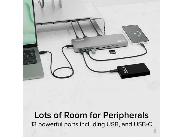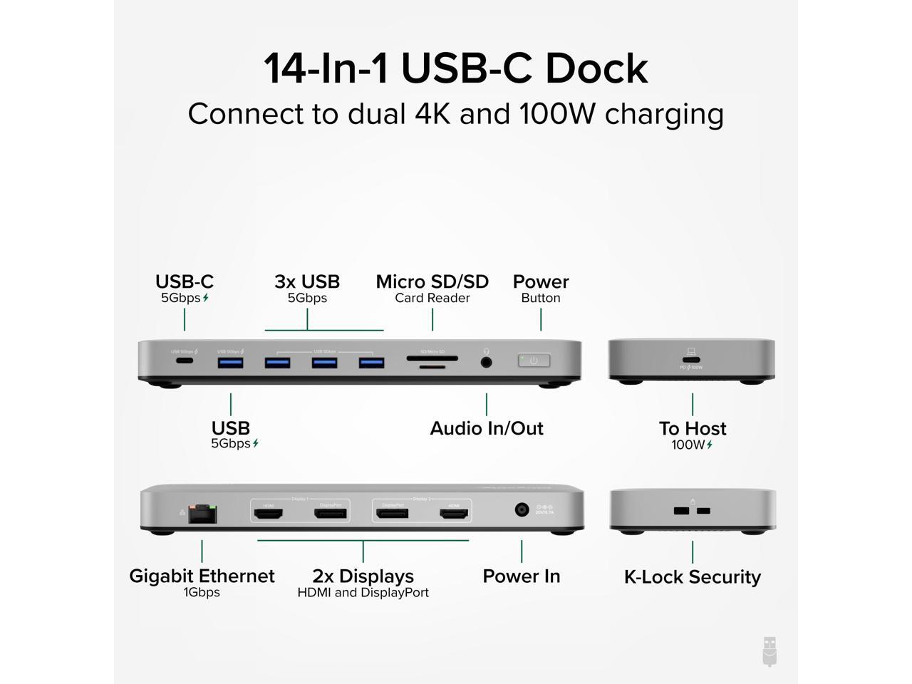 - Fully Connected - 13-port USB C docking station dual monitor hosts 2x 4K monitors in HDMI, DisplayPort or both, 5x USB 3.0 ports, SD and microSD card readers, audio in and out ports, an Ethernet port, and 100W charging no more crawling under the desk to find an outlet