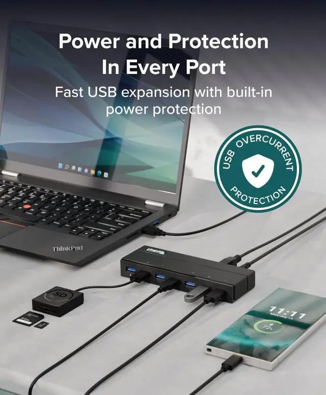 Experience high-speed data transfers with standard USB 3.0 rates up to 5Gbps (640MBps), ensuring fast and seamless file movement between devices. Perfect for USB external hard drives, flash drives, USB graphics adapters, and other high-throughput peripherals, this USB 3.0 port hub powered is built to handle demanding workloads.