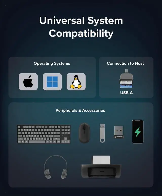 This USB 3.0 hub requires no driver installation, though attached devices may need specific drivers. It is compatible with Windows 11–XP, macOS, and Linux 3.0+.