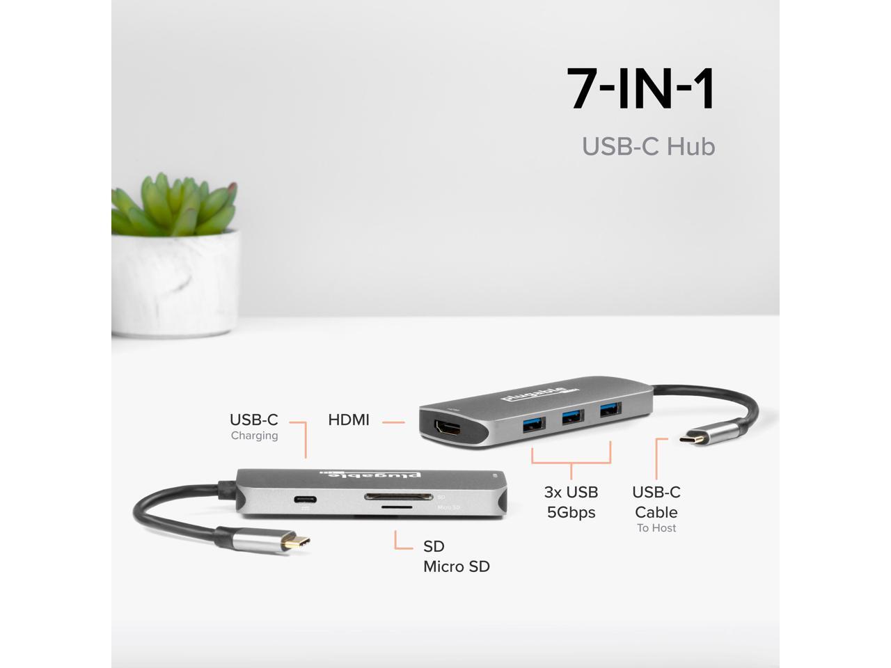 Plugable USB-C Hub 7-in-1, Driverless USB C Hub Compatible with Mac, Windows, Chromebook, USB4, Thunderbolt 4, and More (4K HDMI, 3 USB 3.0, SD & microSD Card Reader, 100W Charging)