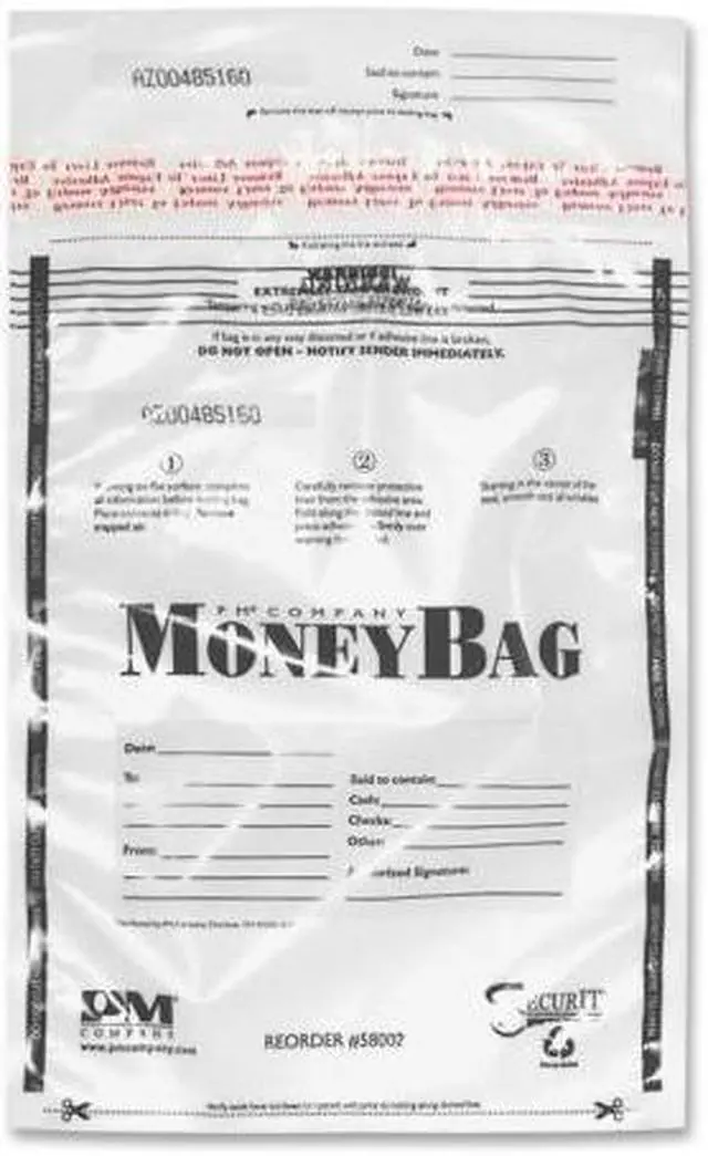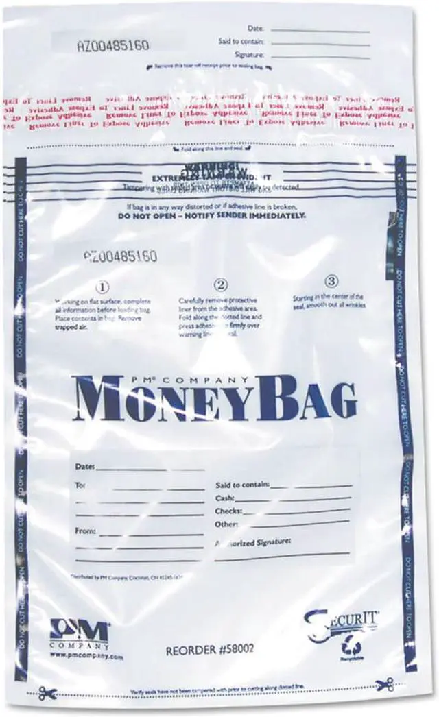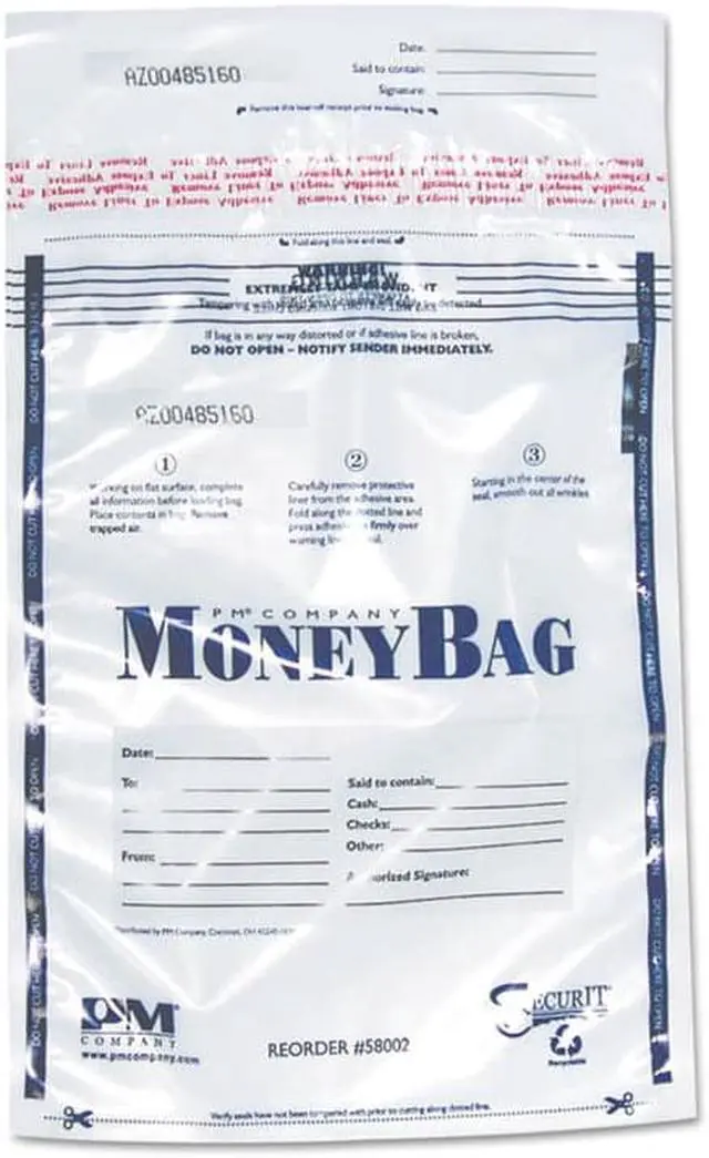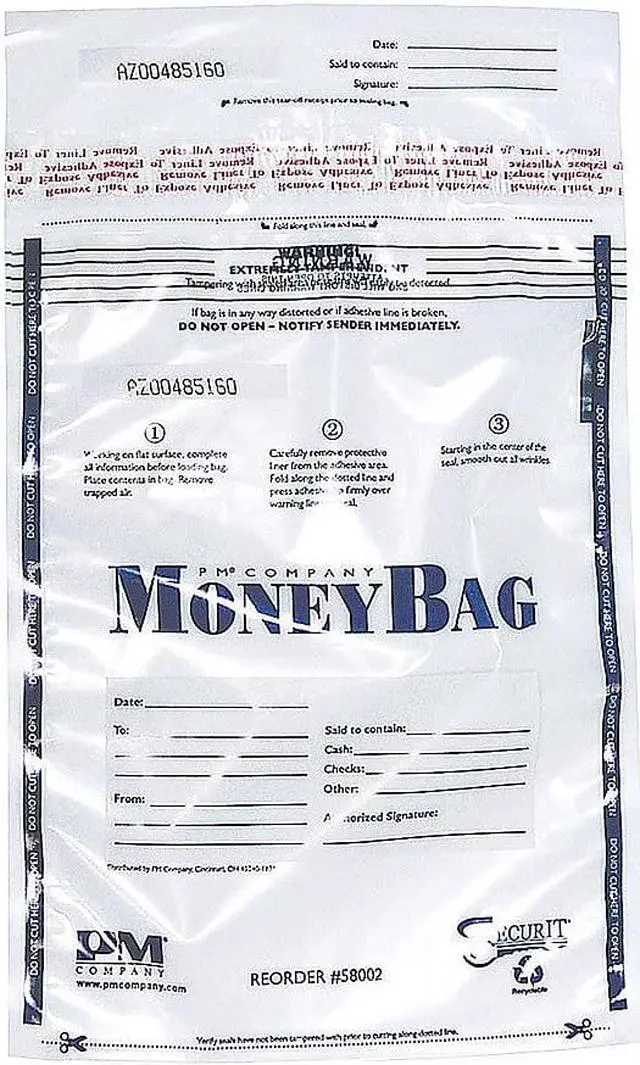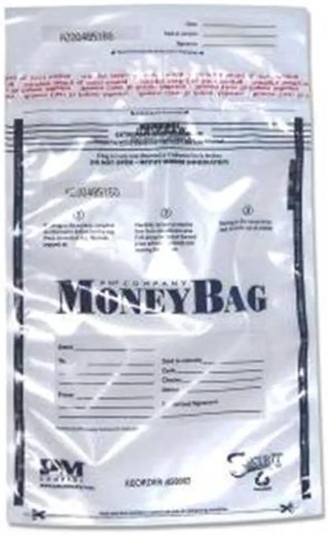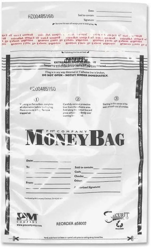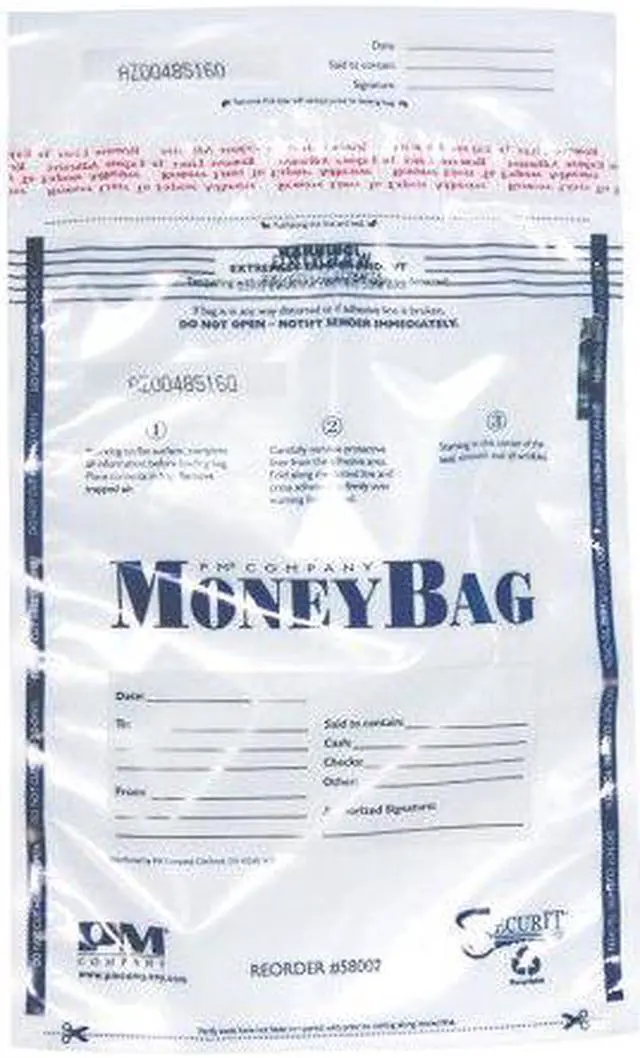 Disposable bag can withstand rough handling. Sequentially numbered with tear-off receipt. Width: 9"; Color(s): Clear; Height: 12"; Material(s): Plastic.