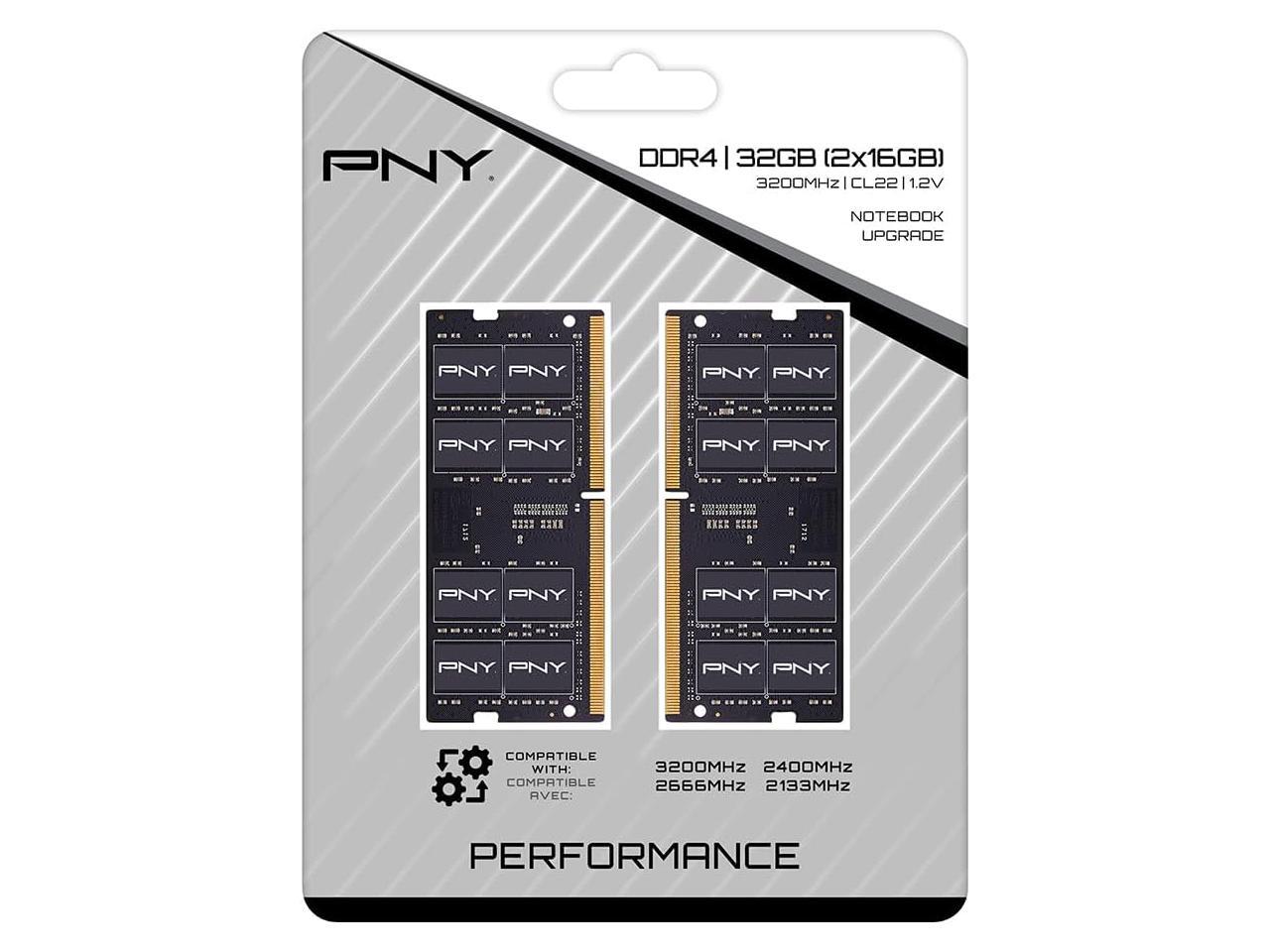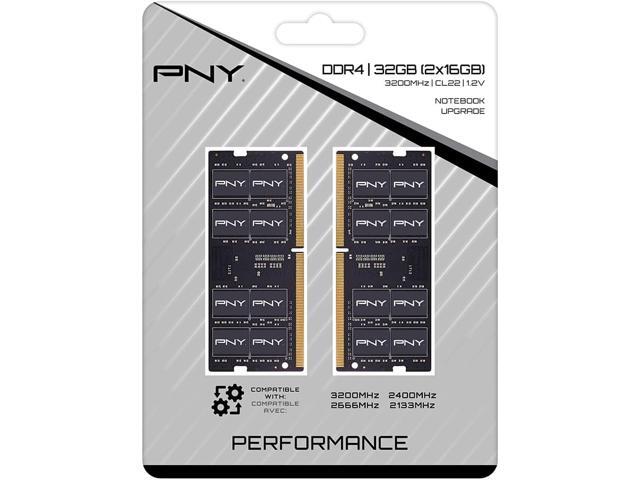 pny performance 32gb (2x16gb) ddr4 dram 3200mhz (pc4-25600) cl22 (compatible with 2933mhz, 2666mhz, 2400mhz or 2133mhz) 1.2v notebook/laptop (sodimm) computer memory kit - mn32gk2d43200-tb